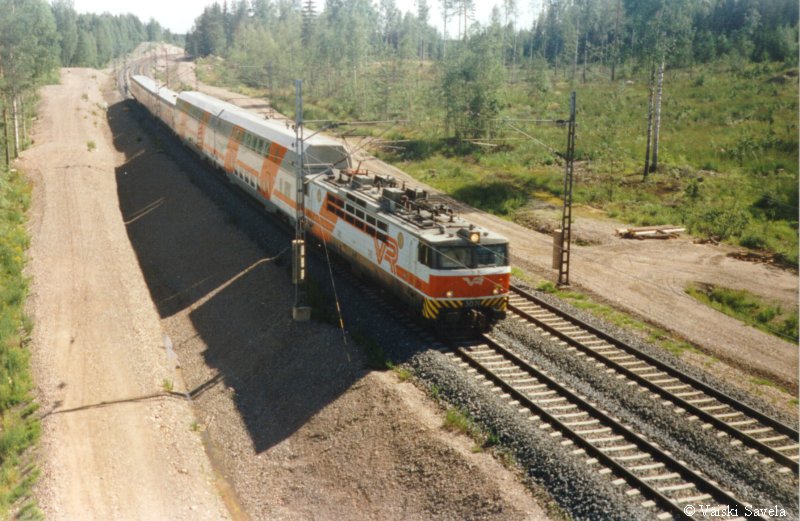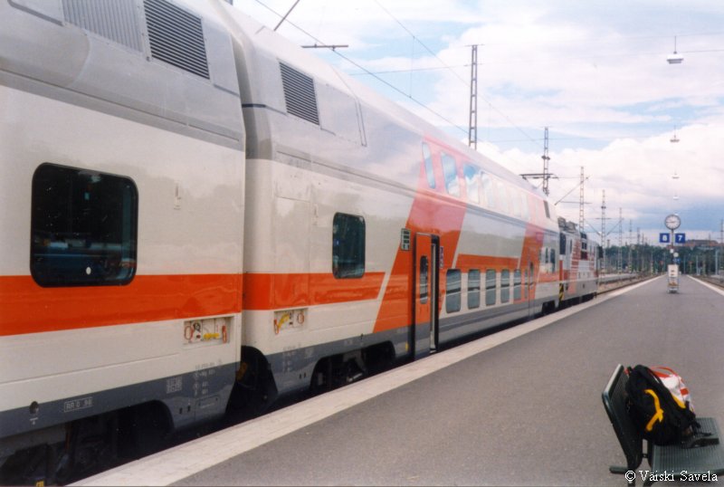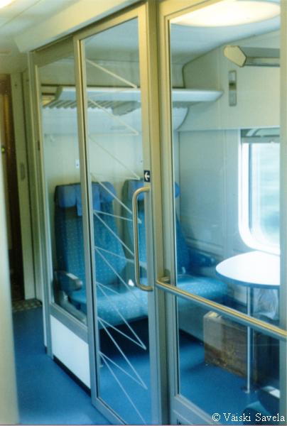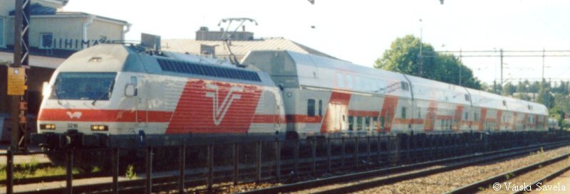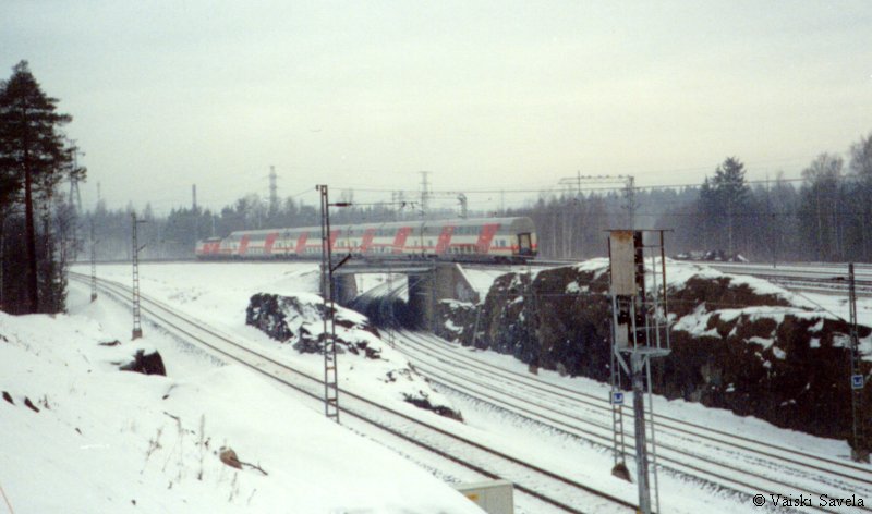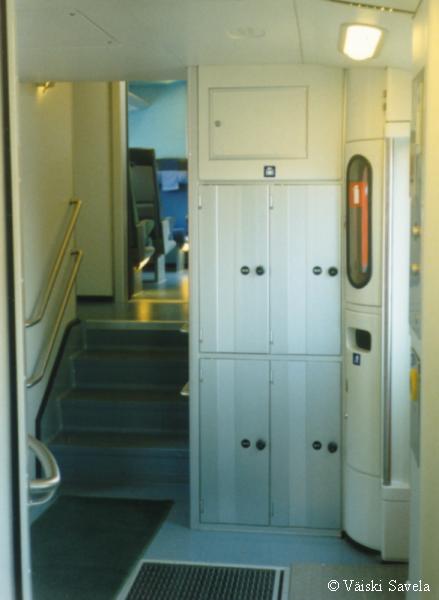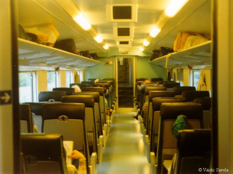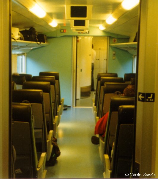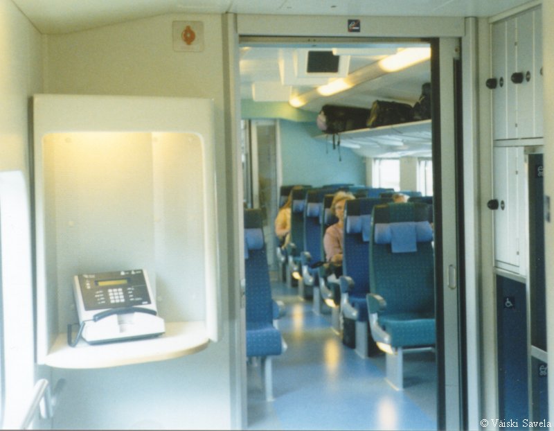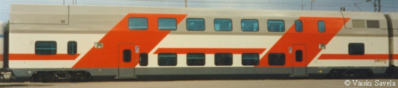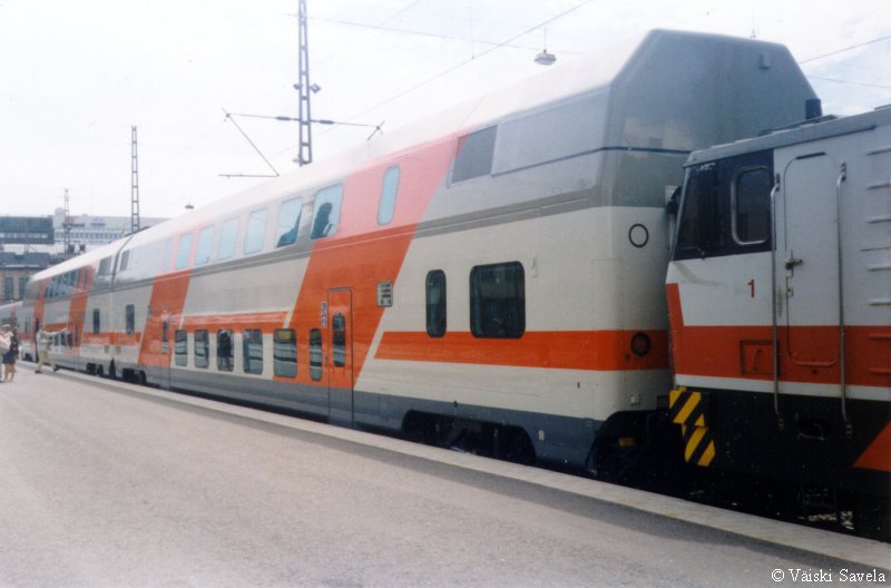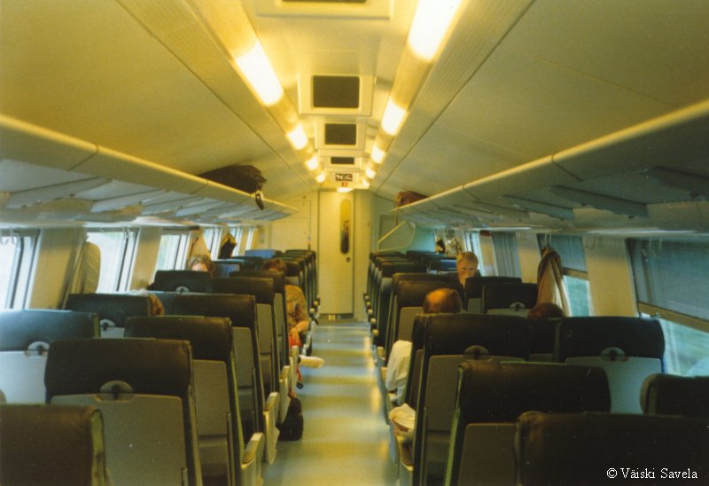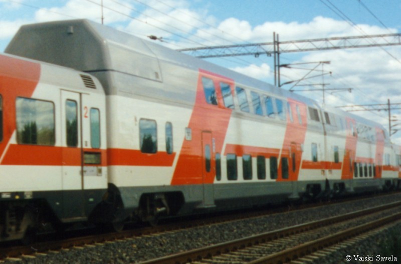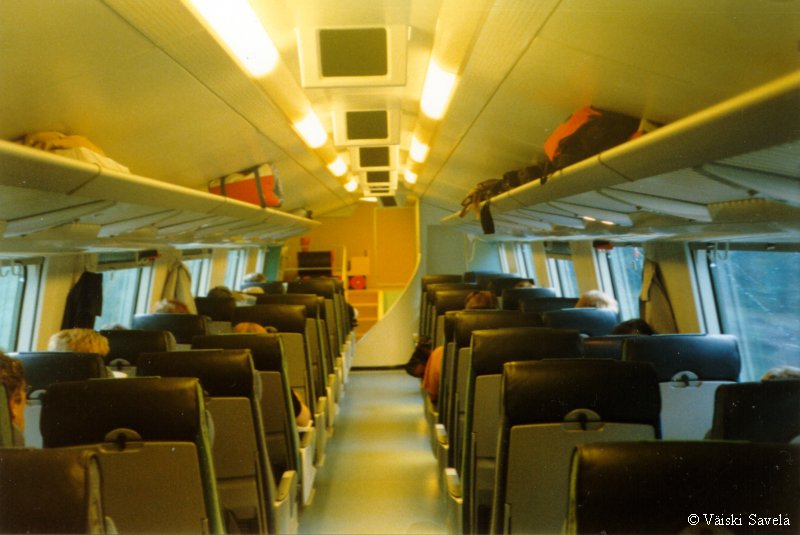 Asemilla, joilla on korotettu laituri tulevat vaunun portaat samalle tasolle laiturin kanssa. Vaunuun meneminen on siis helppoa myös matkatavaroiden/ lastenvaunujen kanssa. Sisällä vaunussa oli vielä uuden vaunun haju tallella. Kuten arvata saattaa, oli vaikutelma vaunusta varsin siisti ja moderni. Polkupyöräpaikatkin vaikuttivat varsin teknisiltä. Vaunujen infomonitorit eivät olleet koko matkan aikana päällä. Itse monitorit ovat aika Pendolinomaisen näköisiä, joskin pienempiä ja sirompia. Myös roskis on Pendolinosta tuttu, muovipussi seinällä- malli. Vaunun päässä oleva hissi on tarkoitettu tarjoilukärryille. Nälän ja janon yllättäessä minun ei siis tarvinnut siirtyä maisemapaikaltani yksikerroksiseen ravintolavaunuun. Ala- ja yläkerran lisäksi vaunussa on istumapaikkoja myös telien päällä normaalilla korkeudella; Palveluvaunussa perhehytti ja matkustajavaunussa allergiahytti, sekä toisessa päässä pieni avo-osasto, istuimet vastakkain. Vaunun kulku on tasaisempaa kuin tavallisessa yksikerroksisessa Ex-InterCity vaunussa. Vaunut ovat myös painetiiviitä, jonka huomaa erityisesti tunneleissa rantaradalla ja Jämsä- Jyväskylä välillä. Tasaisen kulun lisäksi vaunu on hiljainen, varsinkin yläkerrassa on havaittavissa selvä ero tavalliseen vaunuun. Täydellinen vaunun äänieristys ei kuitenkaan ole. Nimittäin aina, kun joku menee seuraavaan vaunuun ja päätyovi on auki, kantautuu muuten niin hiljaisen vaunun yläkertaan melua. Vaunun toisessa päässä on kyllä ovia välissä estämässä melun kantautumista yläkertaan, mutta allergiahyttien puoleisessa päässä väliovia ei ole. Toinen paikka, joka kaipaisi oven on palveluvaunun lasten leikkiosasto. Se nimittäin on samassa avoimessa tilassa kuin koko yläkerran matkustajaosasto. Ja kyllähän pienistä lapsista ääntä lähtee! Parempi ratkaisu olisi ollut rakentaa sille aivan oma osasto. Eli pienillä muutoksilla vaunua voisi vielä parantaa! Yläkerran ikkunat sijaitsevat suunnilleen samalla korkeudella kuin tavallisten junien katot. Vastaan tulevista junista on siis nähtävissä vain katot, mutta muutoin näköalat ovat paljon paremmat. Paikoittain voi vaunusta nähdä aivan uusia asioita, joita ei tavallisista vaunuista näe. Itse huomasin esimerkiksi Saunakalliosta matalahkon kallioleikkauksen taakse kaartavan teollisuusraiteen loppuvankin nykyisin jo ennen kuin se ehtii kunnolla alkaakaan! |